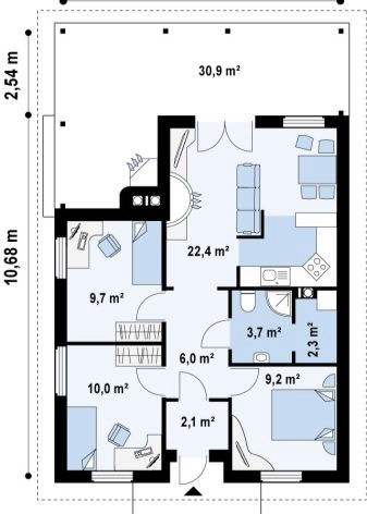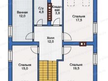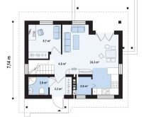 نسخة أخرى من منزل من طابقين في النسخة البولندية تبدأ من شرفة طولها 3 أمتار ، حيث يدخل الناس إلى قاعة طولها 9 أمتار.. تبلغ مساحة غرفة الضيوف الواقعة في الطابق الأرضي 12 مترًا مربعًا. م تمت إزالة الفواصل بين غرفة المعيشة والمطبخ ، لتشكيل مساحة غير قابلة للتجزئة. وأيضا أدناه يجهزون:
