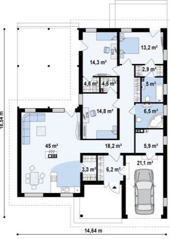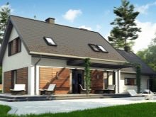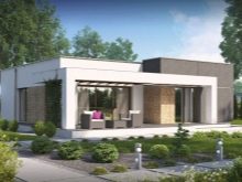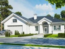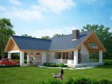 تعتبر خطط الكوخ بارتفاع طابق واحد جذابة للغاية لمعظم المطورين. ومع ذلك ، يتم استكمال أحد هذه الخيارات ، خلافًا للعرف ، بمرآب. صحيح ، في ظروف روسيا ، هذه الإضافة مناسبة تمامًا ، نظرًا للمسافات المتزايدة وعدم القدرة على الاستغناء عن السيارة. الواجهة مشطبة بالجبس الخفيف والخشب. تم تقديم المرآب بمهارة باستخدام نفس تصميم المبنى الرئيسي..