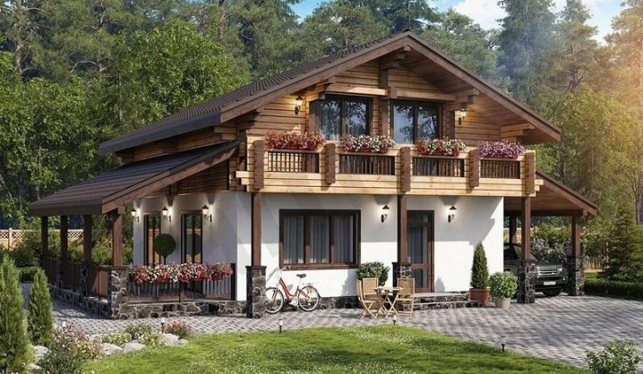 - شاليه. من أجمل الحلول ، ميزته المميزة هي منحدرات السقف التي تبرز خلف الجدران وتحمي المنطقة المجاورة من أي طقس سيء..