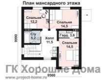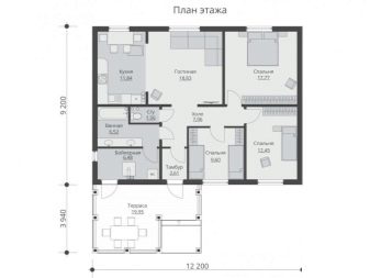 ينبغي النظر في خطة نموذجية أخرى باهتمام كبير.. في هذا الإصدار ، يبلغ حجم المبنى 9.2 × 12.2 مترًا ، وتم تزيين الجدران بانحياز..