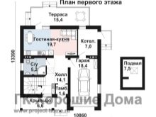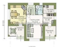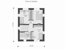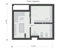 قد يبدو المنزل ذو الطابق العلوي والطابق السفلي مختلفين. حجم أحد الخيارات هو 9.6 × 10 م ويكتمل المبنى بغرفة تقنية (مرجل) بطول 7 أمتار. تبلغ مساحة المطبخ والنزيل 19.7 مترًا مربعًا ، وسيزيد حجم الحمام قليلاً عن 5 أمتار مربعة. م كتلة الطابق السفلي نفسها ستبلغ مساحتها 7.5 م 2.