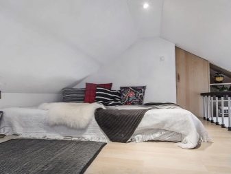 في هذه الحالة ، تصبح العلية مساحة معيشة أنيقة كاملة ، وغالبًا ما تكون غرفة نوم. بالمناسبة ، يوجد القليل مما يمنع وضع شرفة صغيرة جدًا بسياج معدني بالجوار.