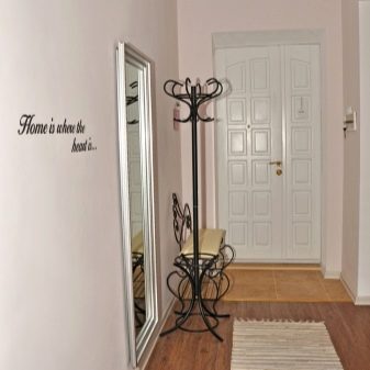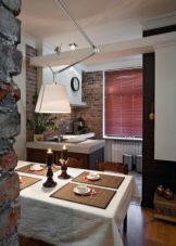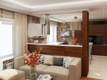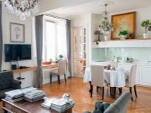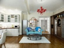 لتوفير المساحة ، يتم دمج المطبخ مع غرفة المعيشة باستخدام قسم مرتجل على محيطهم. وبمساعدة خزانة ملابس واسعة ، يمكنك فصل الممر عن القاعة.