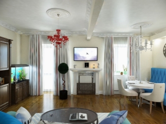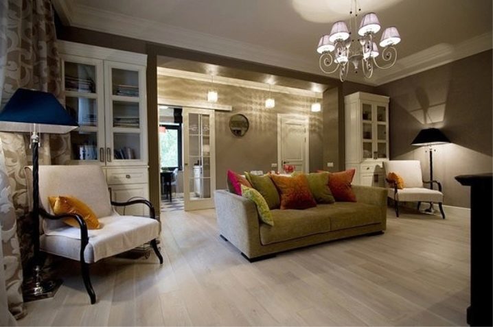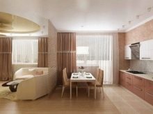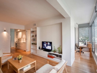 إذا أمكن ، يمكنك هدم أحد الجدران لتوحيد منطقتي المعيشة. وبالتالي ، يمكنك الحصول على غرفة ضخمة لتجمع جميع أفراد الأسرة واستقبال الضيوف. سوف تتسع بسهولة لأريكة زاوية وطاولة قهوة وجدار كامل مع نظام تخزين مدروس جيدًا. أصعب جزء هو إنشاء شقة استوديو. يوفر هذا الخيار هدمًا كاملاً للجدران ، مما يؤدي إلى تحرير المساكن من الحواجز..