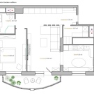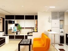 ميزة هذا الخيار هي أن الجمع بين منطقتين مهمتين سيؤدي إلى زيادة بصرية في المساحة. تنص الخطة على فصل غرفة المعيشة في المطبخ عن غرفة النوم باستخدام قسم محمول يقسم الغرفة إلى منطقتين وظيفيتين. يمكن أن تتسع منطقة النوم لسرير مزدوج وخزانة ملابس وحتى مكتب ويمكن تركيب أريكة قابلة للتحويل في غرفة المعيشة..