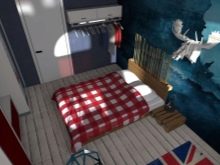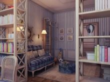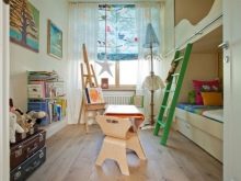 الميزة الرئيسية لهذا الحل هي أن الغرفة تتيح وضع سرير مفرد للطفل محاط برفوف. يتيح لك ذلك تنظيم مناطق ترفيهية لكل من البالغين والأطفال في غرفة واحدة. وللأنشطة أو التدريبات اللامنهجية ، يمكنك تجهيز شرفة.