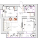 يوفر هذا المشروع غرفة مشتركة للمطبخ وتناول الطعام ، وحمام منفصل ، بالإضافة إلى غرف نوم للأطفال والكبار مع إمكانية الوصول إلى لوجيا. يتم وضع الأثاث حول محيط الغرف من أجل الحفاظ على المساحة الخالية من الجزء المركزي. الأريكة مفصولة برف يمكنك تخزين كتبك فيه. تُستخدم الشرفة الزجاجية كدراسة وتتضمن مكتبًا مدمجًا للكتابة وكرسيًا وحافظة أقلام رصاص.