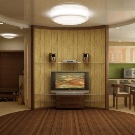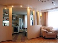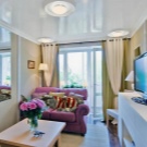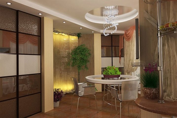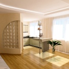 للمطبخ – الحد الأقصى من الستائر أو الستائر الرقيقة. ستكمل الإضاءة العمل على توسيع المساحة. من الأفضل رفض الثريا المركزية.. الإضاءة الموضعية أكثر ملاءمة, تقع على طول الجدران. يمكنك إبراز الأثاث الزجاجي أو الجدران مع لمسات للوحات والمرايا. يمكن ترك غرف المعيشة منفصلة إذا تم التعامل مع المساحة بشكل صحيح.