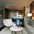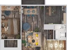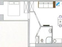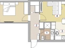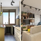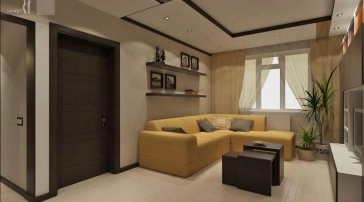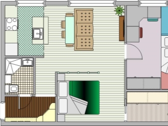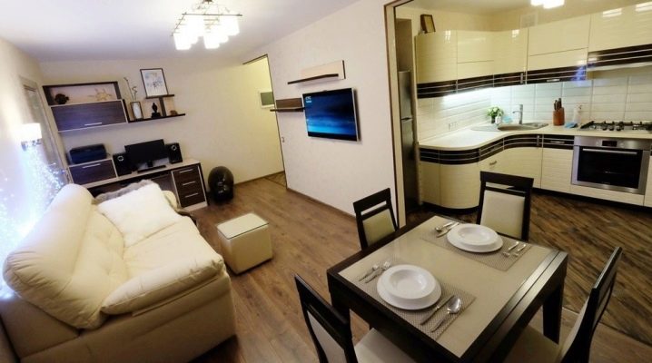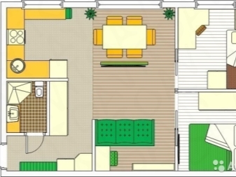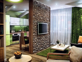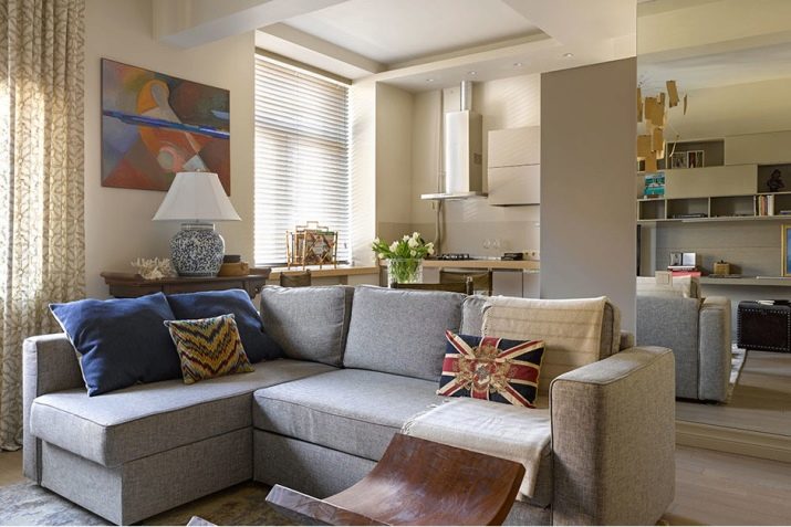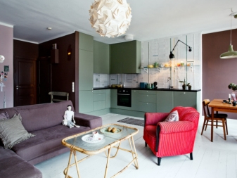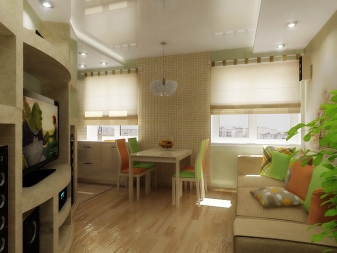 - يتم الجمع بين غرفة المعيشة والمطبخ (لا تنسَ أن منطقة العمل في المطبخ يجب أن تكون مغلقة على الأقل بقسم متحرك) ؛