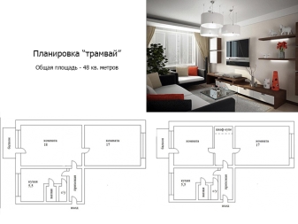 - خيار “الترام” غير ناجح للعيش إذا كان هناك أكثر من شخصين في الأسرة. عندما تنتقل إحدى الغرف إلى أخرى ، يتعين على شخص ما أن يعيش في الممر. في مثل هذه الحالات ، يتم إطالة الممر وتصبح الغرف منفصلة. ونهاية الممر تستخدم مع خزانة ملابس واسعة ؛