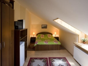 لن يكون من غير الضروري أن يكون لديك مرتبة ناعمة ومريحة ، وأغطية سرير جميلة ، ويمكنك أن تفهم على الفور أن المالكين قد اهتموا حقًا براحة الضيوف. وبطبيعة الحال ، سوف تشغل معظم الغرفة ، والتي لم يتم تزيينها إلا بخزانة ملابس عملية وزوج من طاولات السرير..
