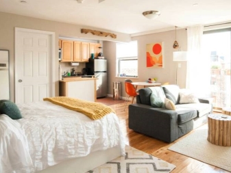 شقة الاستوديو هي غرفة ذات مخطط مفتوح. يوجد في مثل هذه الغرفة الحد الأدنى لعدد الأقسام ، ولا يتم فصل المطبخ بجدار عن غرفة المعيشة والدراسة. ولكن هناك أيضًا مناطق منعزلة ، على سبيل المثال ، حمام. يمكن أيضًا فصل غرفة النوم عن الاستوديو..