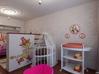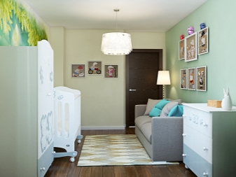 إذا كان لديك طفل ، ولكن حتى الآن لا توجد طريقة للانتقال إلى شقة أكبر ، فيمكنك تجهيز منطقة لحضانة في استوديو من غرفة واحدة. ضع سرير الأطفال بجوار الأريكة أو افصله بحاجز منمق. يوجد بالقرب من مكان لطاولة أو خزانة ذات أدراج صغيرة حيث سيتم تخزين أشياء الأطفال.