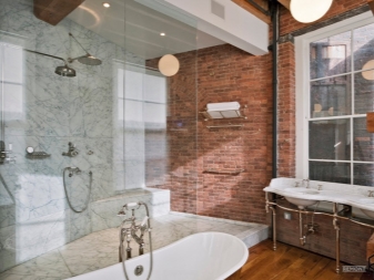 - حمام. أفضل حل لهذه الغرفة هو الطوب الزجاجي. بفضل قوتهم ، يمكن أن يصبحوا زخرفة أرضية جميلة وموثوقة في نفس الوقت. أما بالنسبة لجدران الحمام ، فمن المعقول تزيينها بأي تقليد لأعمال البناء بالطوب المقاوم للتعرض المنتظم للرطوبة..