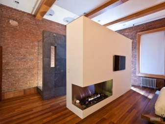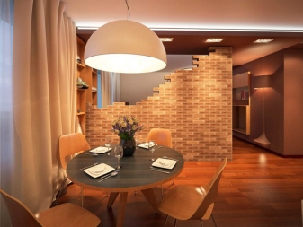 سيبدو تقسيم الطوب غير عادي للغاية. في كثير من الأحيان ، يصنع المصممون ما يسمى “الجدار غير المكتمل” ، والذي يفصل ، كما كان ، بين عدة غرف. هذه التقنية مناسبة بشكل خاص لأسلوب الدور العلوي..