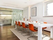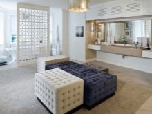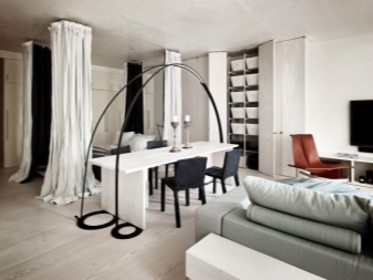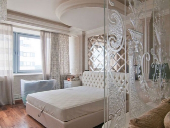 تبدو تقسيم الستائر والمنسوجات الأخرى باهظة الثمن وأنيقة. أيضًا ، يوصي الخبراء بالاهتمام بالشاشات والأقسام البيضاء المنحوتة. الأبيض هو لون وظيفي يمكن أن يكمل أي ديكور داخلي..