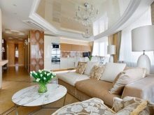- تبدو الألوان الفاتحة جنبًا إلى جنب مع الرخام الأبيض رائعة أيضًا في غرفة المعيشة. هذه اللوحة تخلق انطباعًا بجو المساحة وتضيف رفاهية رائعة إلى الغرفة ، مثل صالون القصر..