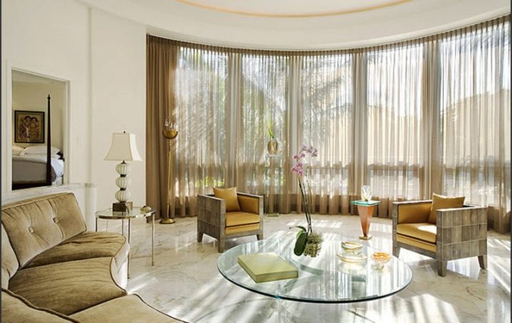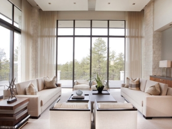 لكنها جيدة بشكل خاص في الاتجاهات ايكو ودور علوي. إنها تسمح لك بتزيين الغرفة بستائر فاخرة ، وتجعل من الممكن استخدام المنسوجات بجميع أنواعها. لكن من المهم أن تتذكر أنه بالنسبة للنوافذ الضخمة ، يتم شراء المنسوجات ، كقاعدة عامة ، حسب الطلب ، لأن هذا الحجم ليس قياسيًا. لكن في هذه الحالة ، على العكس من ذلك ، يمكنك الفوز بإنشاء تصميم خاص لتزيين النوافذ.