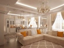 عادة ما يكون السقف في غرفة كلاسيكية جديدة مزينًا بثريا ضخمة. هذا التركيز سيجعل الغرفة أكثر نبلاً. بالمناسبة ، هذه واحدة من الرقائق الرائدة في الطراز الكلاسيكي الجديد..