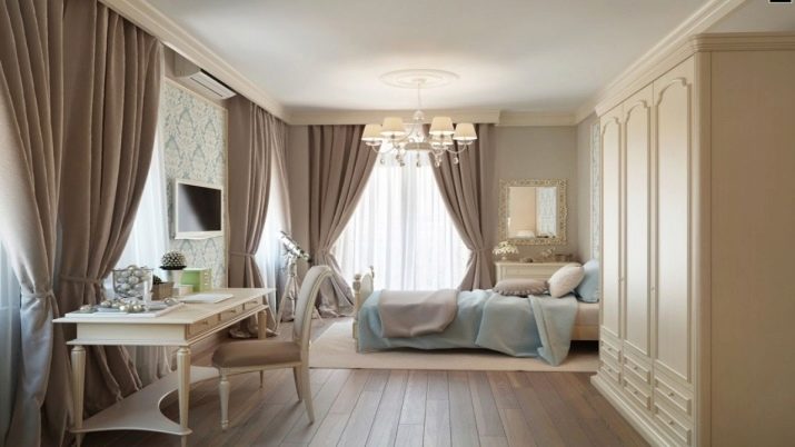 - ستضيف الستائر الفرنسية الفخامة وبعض المسرحية إلى الغرفة. لذلك ، إذا كنت ترغب في تحقيق مزاج رائع في الداخل ، فامنح الأفضلية لهذا النوع من المنسوجات..
