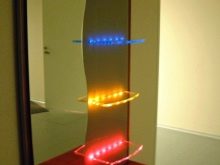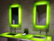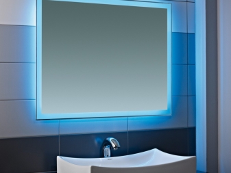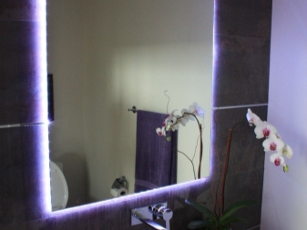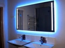 نظرًا لتنوع وتوافر أجهزة الإضاءة المختلفة ، فإن اختيار خيار زخرفة الإضاءة يعتمد فقط على رحلة خيالك. إذا كنت ترغب في ذلك ، يمكنك إنشاء إضاءة خلفية متعددة الألوان ، ولكن لا يزال يتعين عليك شراء وحدة تحكم خاصة في المتجر ، والتي ستتيح لك جمع كل هذا الجمال متعدد الألوان في شبكة واحدة. أيضًا ، يمكن توصيل الشريط ليس فقط على طول الحافة ، ولكن أيضًا لإنشاء نمط معين. يمكنك اختيار أي شكل من أشكال المرآة. كل هذا يتوقف فقط على تفضيلاتك.