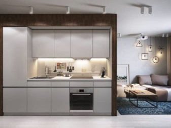 بتصميم ضيق ، يمكن وضع مجموعة المطبخ في جزء واحد من الغرفة من ثلاث جهات: يتم وضع جدار مجاني جانبًا لمنطقة تناول الطعام ، مع وضع طاولة مريحة والعديد من الكراسي فيه. عند التخطيط ، ضع في الاعتبار موقع المدخل: في بعض الأحيان توجد طاولة مع كرسيين مدمجين في الزاوية.