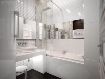تبسيط مسائل التنظيم, الابتدائية والبساطة مهمة ، عدم وجود تفاصيل زخرفية صغيرة. سيسمح لك ذلك بالتغلب على نقص المساحة وسيمنحك الفرصة لتجربة الشكل والحجم وتقنية الترتيب. في الزخرفة ، نرحب بالألواح البلاستيكية والبلاط وورق الحائط القابل للغسل والمقاوم للرطوبة. إذا توفرت مساحة ، فمن المستحسن وجود طاولة صغيرة ومرآة ، ورفوف مدمجة.