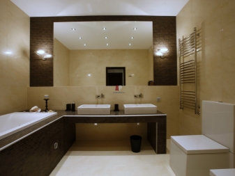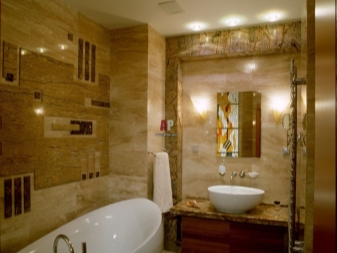 تعتمد إمكانيات الحمام على شكل الغرفة. يمكن أن يكون حوض الاستحمام كلاسيكيًا أو مدمجًا. اليوم ، يتم الترحيب ببيئة العمل جنبًا إلى جنب مع التطبيق العملي والجمال ، معبراً عنه بألوان طبيعية للوحة ، وتكرار الحجر الطبيعي والخشب والرمل.