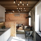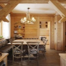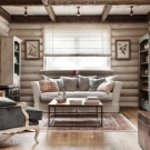 يؤكد الأسلوب الوحشي ، وهو مزيج من بلد أمريكي وكوخ روسي نموذجي على مزيج من المواد الطبيعية مع الحد الأدنى من المعالجة السطحية وإنجازات التقدم العلمي. هذه هي الأسقف ذات الحزم ، واللون الخشبي للكسوة الأرضية والجدران ، ومجموعة من المصابيح المقتضبة مع مصادر الضوء ذات النقاط الثنائية..