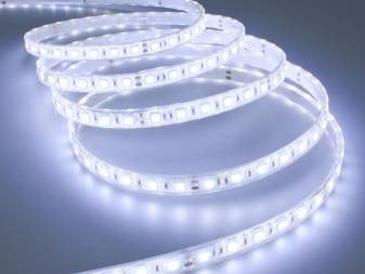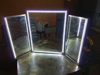 تساعد الإضاءة الداخلية على توزيع الضوء بالتساوي. لا تحتاج إلى إجهاد عينيك ، حيث يظهر الانعكاس بوضوح في المرآة. لتثبيته ، سوف تحتاج إلى شراء لمبات إضاءة شريطية LED. وهي متصلة بالجزء القذر من القماش ، غير مغطاة بألماغاما.