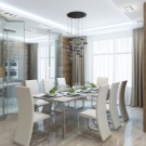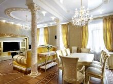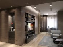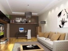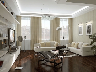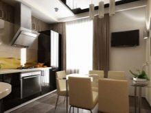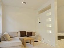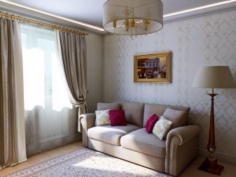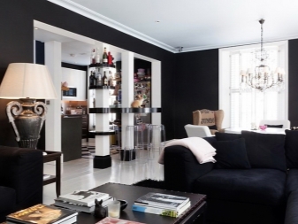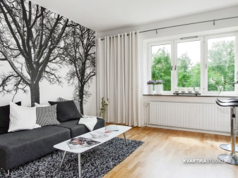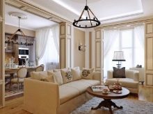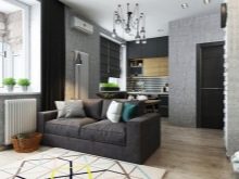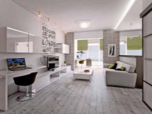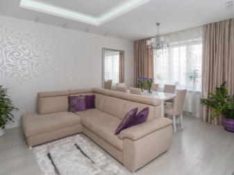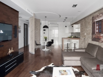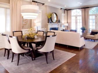 إذا كان من الضروري الجمع بين غرفة المعيشة والمجالات الوظيفية الأخرى للشقة ، فأنت بحاجة إلى التأكد من أن المناطق الداخلية لمنطقتين متجاورتين لا تدخل في مواجهة ، ولكنها تظل ثابتة في مفتاح واحد.