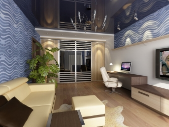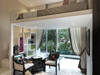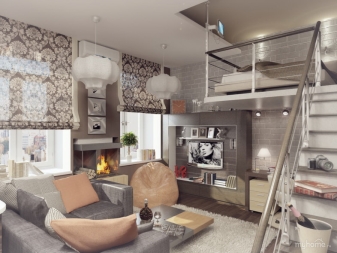 طريقة غير معتادة للجمع بين العديد من المساحات متعددة الوظائف هي خيارات التنسيب ذات المستويين. في هذه الحالة ، يوجد ما يسمى بالبنية الفوقية في الشقة ، والتي تخلق تأثير المظلة أو الطابق الثاني ، مما يسمح لك بوضع مناطق على مستويات مختلفة ، وغالبًا ما يتم إنشاء هذه المجموعات لغرف المعيشة وغرف النوم. لذلك ، في الأعلى يوجد السرير ، وأسفل غرفة المعيشة..