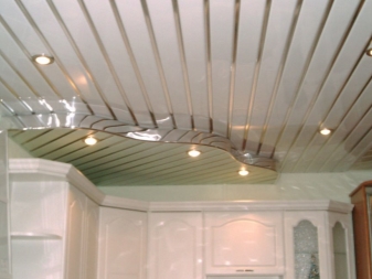 يمكن أيضًا تعليق السقف ، حيث يتم استخدام أدلة معدنية هنا ، والتي على مسافة ما من السقف تحتوي على ألواح خاصة من اللوح الجصي أو مواد أخرى.