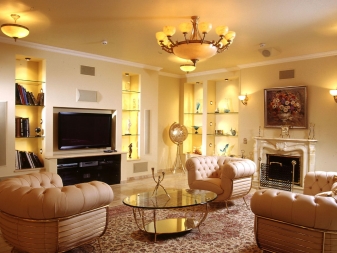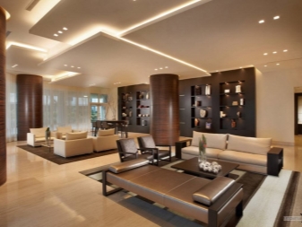 تتميز الأسقف المعلقة والمعلقة بوظيفة تضمين الأضواء ، والتي لا توفر إضاءة إضافية فحسب ، بل توفر أيضًا ديكورًا غير عادي. يمكنك ترتيب المصابيح بترتيب مختلف ، وإنشاء أنماط كاملة من عناصر الإضاءة. أكثر خيارات التنسيب شيوعًا هي الهلال والدائرة والمربع.