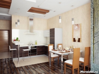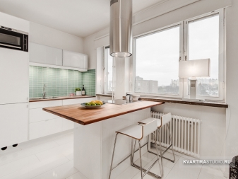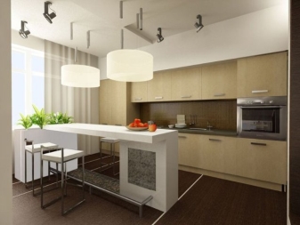 إذا تم دمج المطبخ مع غرفة الطعام ، فمن الضروري أن تسجل في مشروع التصميم طرق وضع منطقة تناول الطعام. يمكن أن تكون إما قائمة بذاتها ، لذلك غالبًا ما تستخدم زوايا المطبخ ، أو تكون جزءًا من سماعة رأس – مثل هذه الخيارات عبارة عن عداد شريط منمق. في أغلب الأحيان ، في حالة استخدام هذه الطريقة ، من الضروري شراء براز مرتفع.