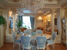 - فرنسي. هذا النمط أنيق للغاية ومتطور ، وغالبًا ما يوجد في زخرفة غرف المعيشة وغرف الطعام. السمة المميزة لهذا النمط هي استخدام المفروشات الرخيصة ، الشيء الرئيسي هنا هو الذوق والتطبيق العملي. تتميز أنظمة الألوان على الطراز الفرنسي دائمًا بأنها فاتحة وباستيل. غالبًا ما تستخدم ألوان أرجواني وبيج وخضراء..