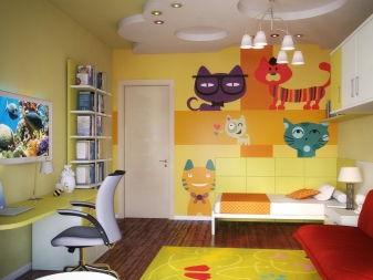 بالنسبة للأطفال الهادئين ، ستصبح اللمسات المشرقة في البيئة مناسبة للفرح والمزاج الجيد. الألوان الأكثر شيوعًا المستخدمة في الحضانة هي: الأصفر والأزرق والأزرق والأخضر الفاتح والبرتقالي والبيج والوردي والأبيض. يمكنك إضافة صور لشخصيات كرتونية أو شخصيات من حكاياتك الخيالية المفضلة إلى الزخرفة.