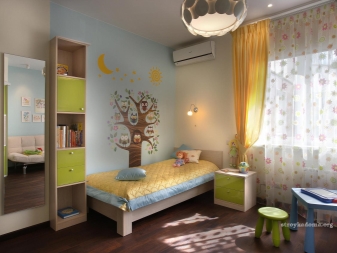 بالنسبة لتأثيث مثل هذه الغرفة ، من المهم معرفة متى يجب التوقف وعدم زيادة المساحة – فكلما زادت المساحة الحرة ، زادت مساحة نشاط الطفل في عالمه الصغير. لذلك ، من الضروري وضع قطع الأثاث الضرورية فقط: سرير مع مرتبة لتقويم العظام وطاولة وخزانة ملابس ومكان لتخزين الألعاب ، بالإضافة إلى أنه يمكنك وضع أريكة صغيرة أو عثمانيين ناعمين في حالة قدوم الضيوف للطفل..