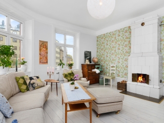 - يمكن استدعاء واحدة من أكثر الوظائف النمط السويدي التسجيل. الداخل هنا دائمًا ما يكون عائليًا ودافئًا للغاية. نادرًا ما تستخدم الألوان الداكنة في هذا النمط ، أساس هذا النمط هو قواعد فاتحة مع لمسات مشرقة وخشب طبيعي في الأثاث والديكور.