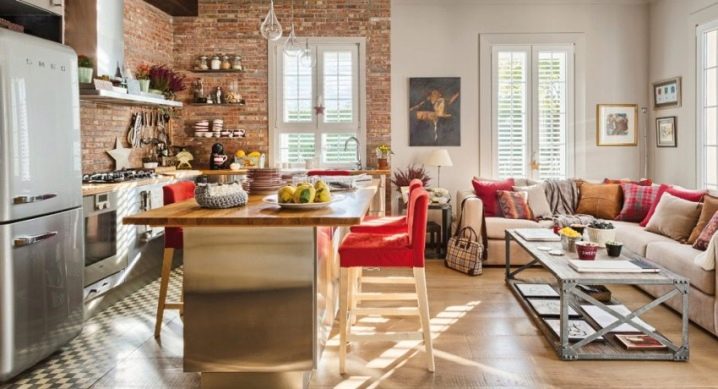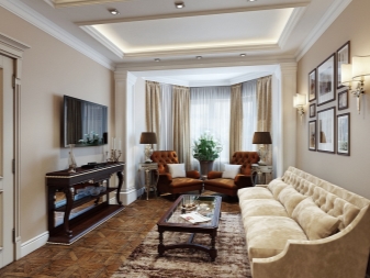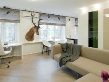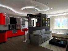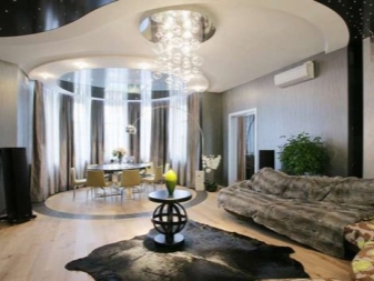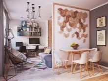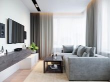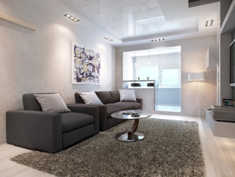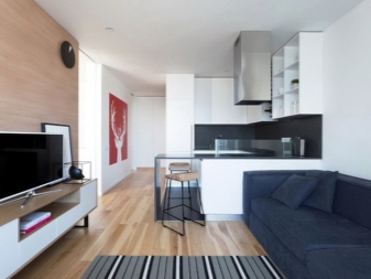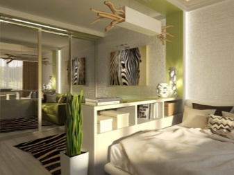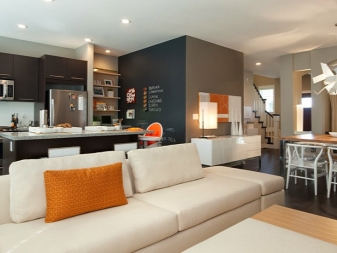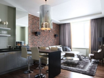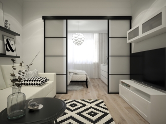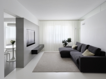في غرف المعيشة المستطيلة ذات الأبعاد الكبيرة ، يمكن تقسيم المناطق باستخدام أقسام مصنوعة من ألواح الجبس والزجاج والبلاستيك واللوح الرقائقي والورق والمنسوجات. يمكن فصل غرفة النوم عن غرفة المعيشة بمساعدة الستائر الشفافة الناعمة. تم عزل مجموعة المطبخ بنجاح باستخدام عداد بار.