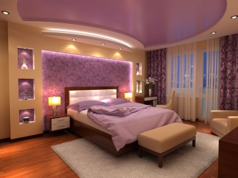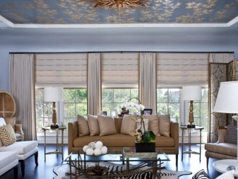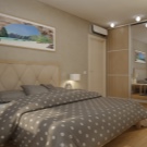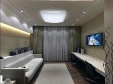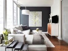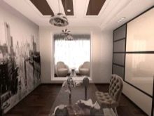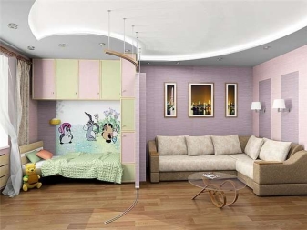 في شقة من غرفة واحدة ، يمكنك بنجاح الجمع بين غرفة المعيشة وغرفة النوم أو الحضانة. يجب تجنب الظلال الداكنة والمشرقة للغاية. سوف يساعد السقف الإنشائي في تقسيم المناطق.
