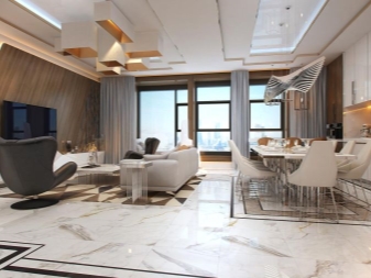 غرفة 16 ، 17 متر وأكثر يعطي أقصى مجال للخيال. هنا يمكنك ترتيب تصميم لأي نمط ونظام ألوان وموضوع. في هذه الحالة ، يمكنك التقديم وتقسيم المناطق والجمع بين غرف مختلفة – المطبخ وغرفة المعيشة وغرفة المعيشة وغرفة النوم. يتم تقسيم المناطق حسب الموضوع: للاسترخاء وللضيوف والعمل والقراءة وشرب الشاي. يمكن التأكيد على كل ركن من خلال الإضاءة وتسليط الضوء على الألوان.