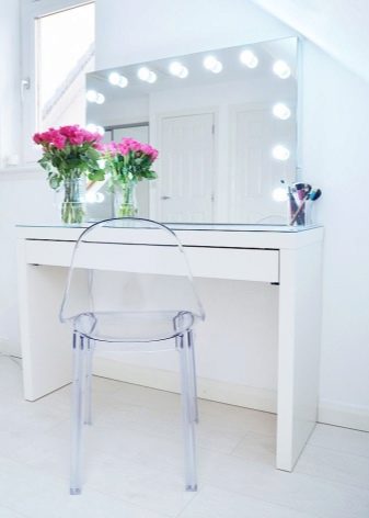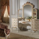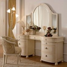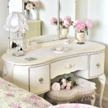 وانتبه أيضًا إلى التعريشات ذات الأرجل العالية والمرايا الكبيرة الحجم وعدد قليل من الأرفف لتخزين مستحضرات التجميل والإكسسوارات. تبدو هذه المنتجات رائعة للغاية ، خاصة إذا وضعت مزهرية جميلة من الزهور على سطح العمل. من الأفضل اختيار الكراسي لمثل هذه التعريشات..