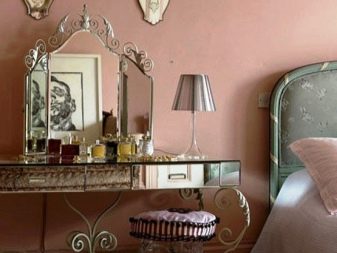 لا تنس أن هناك فرقًا بين منضدة الزينة والتعريشة ، لذلك ، بناءً على مساحة الغرفة ، اختر المنتج المناسب الذي لن يقيد الغرفة ويقلل من مساحتها بصريًا. يجب أن يكون كل شيء متناغمًا.