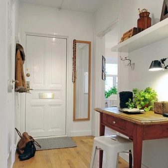 - في الحمام سيكون الخلاص صغير الحجم هو استخدام مرآة مع رف. لن تقلل المساحة بصريًا ، لكنها ستكون عملية وسهلة الاستخدام..