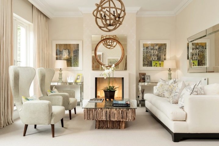 إذا قررت تزيين الحائط في غرفة المعيشة بلوحة مرايا ، فسيؤدي ذلك إلى زيادة حجمه بصريًا ، لكنك لست بحاجة إلى إساءة استخدام العناصر الزخرفية الأخرى. ستبدو الغرفة مزدحمة. خيار آخر مثير للاهتمام هو وضع مرآة مستديرة صغيرة فوق المدفأة وعلى جانبيها بشكل متماثل لوحتان أو أربع لوحات بأحجام صغيرة في موضوع واحد. في تصميم داخلي باروكي صارم وفخم ، سيكون هذا حلاً رائعًا وفاخرًا..