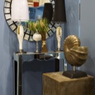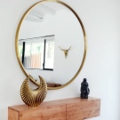 يبرز الإطار المربع العاكس جمال الشكل الدائري والإطار الذهبي. يكمل تقليم الثريا في موضوع مماثل النمط الكلاسيكي الجديد لغرفة المعيشة. والألوان الفاتحة هي الخلفية المثالية للتفاصيل الساطعة والجريئة..