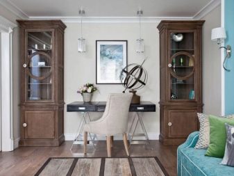 التفاصيل ، الأشياء الصغيرة ، السكتات الدماغية يمكن أن تكون سخيفة وغريبة. من الجيد وجود مصباح بغطاء فريد على الرف. في المكتب ، لا صلة له بالموضوع. إذا اخترت أسلوبًا عصريًا ورتبت فيه غرفة عصرية أنيقة ، فيمكنك تجنب الأخطاء. الحلول العصرية متعددة الاستخدامات. هذه فرصة رائعة لتجربة شيء غير عادي لنفسك ، جديد ، تعلم شيء ما ، توسيع آفاقك ، تغيير الصورة النمطية.. التغييرات لن تضرب جيبك ، لأن المساحة صغيرة.