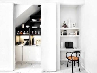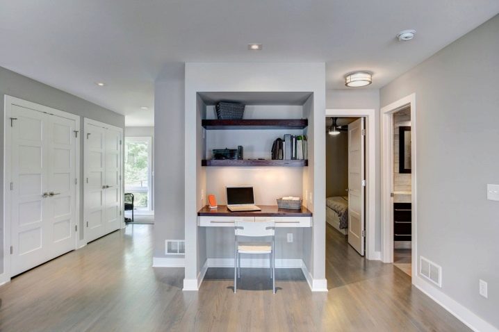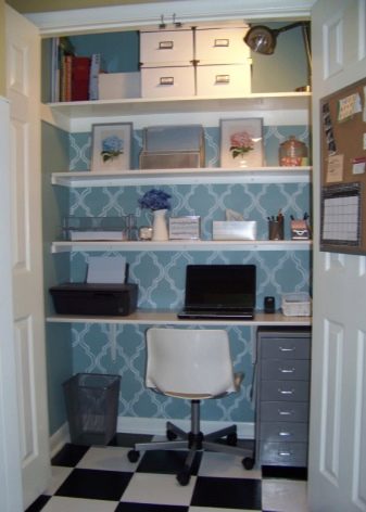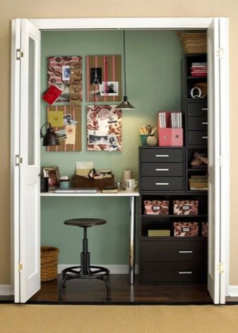 تحتوي كل شقة تقريبًا على غرفة تخزين. عادة ما يتم وضعها بعيدًا قليلاً عن الغرف ، معزولة. ستساعد أبوابه على إكمال يوم العمل في غضون دقائق وإخفاء هذه المساحة عن أعين الضيوف. الشخص الذي يعمل في المنزل سوف ينسى العمل في بضع دقائق. هذه الفوائد كبيرة.