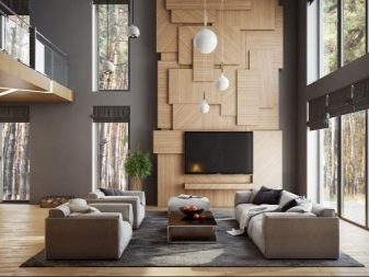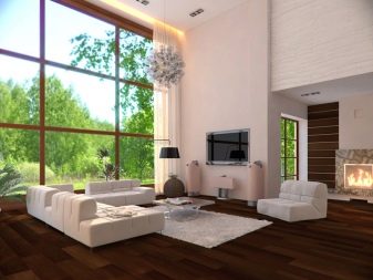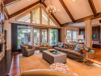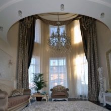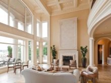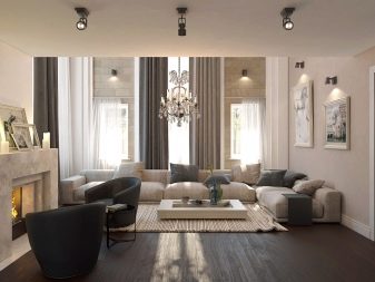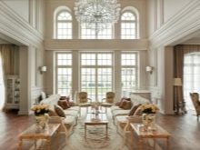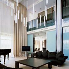 نظرًا للمساحة المثيرة للإعجاب والحجم المثير للإعجاب للغرفة في الديكور ، من المهم فقط استخدام تلك الأشياء التي تتوافق مع المساحة في الحجم ولن تضيع على خلفيتها. عند تثبيت المصباح الثاني ، يجب إيلاء اهتمام خاص لتصميم النوافذ.. يمكن أن يخلق الكثير من الزجاج انطباعًا محبطًا ، ولكن في نفس الوقت ، من المستحيل أيضًا إخفاء النوافذ تمامًا خلف الستائر متعددة الطبقات. هذا هو السبب في أن من أهم مهام المصمم العثور على “الوسط الذهبي”.